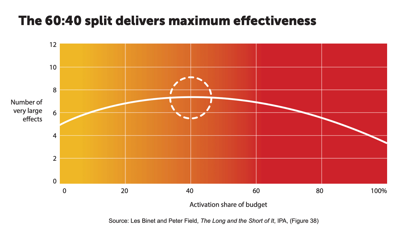 The 60:40 rule emerged from one of the most influential bodies of evidence in marketing effectiveness. In their work for the IPA, Les Binet and Peter Field analysed hundreds of campaigns across multiple categories and found that those which allocated around 60 per cent of their media budget to long-term brand building and 40 per cent to short-term activation consistently outperformed others in terms of business outcomes. These included profit growth, market share gains, pricing power and customer acquisition.